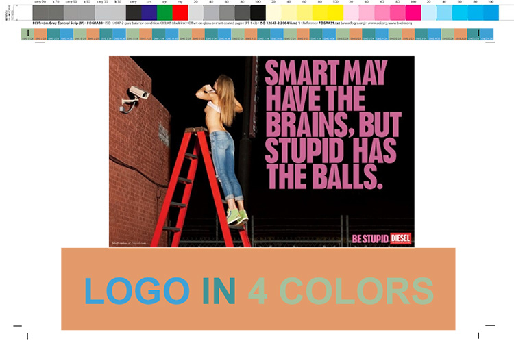 You can order either coated or uncoated tickets - in the case where you are using either standard or ECO SMS colours. Both will display the same colours but it is a good idea to send a coated ticket to your Printer, if you are planning to print on coated paper and an uncoated ticket, if you are planning to print on uncoated paper, not to cause confusion. Keep in mind that the SMS MAX colours are only made for printing on coated substrates and thus only coated proofs are available - according to Fogra 51 by default. The cost of an A4 size containing 8 SMS tickets with your brand colours (up to 5 SMS colours pr. ticket) is EUR 113 or roughly EUR 14 pr. ticket if you are not an SMS subscriber, EUR 70 if you are an SMS subscriber (EUR 8.75 pr. ticket). Postage to your location is added to the price. 4. Enabling Quality Control of your layout with focus on your SMS colours (optional) The SMS CMYK colourcubes you receive if you order them from Spot-Nordic are approx. 15 x 15 mm each (measureable area approx. 10 x 15 mm), so if you are not stretched for space - i.e. if the final size of the production substrate is large enough, you might even want to consider setting up an extra colourbar, consisting only of your own SMS CMYK colours and place it outside the cropmarks, preferably just above the spot where the SMS colours are being used. Try to make sure that the custom SMS colourbar is in the same direction as the actual colourbar, which the Printshop usually adds before outputting the job, - like here below. The reason why this is relevant is that the ink amount in printing, during production is adjusted based on this colourbar and the ink flows across the colourbar (from below and up as an example, if you look at the picture here below) and if you want to check afterwards, whether your SMS colours were correct exactly where your SMS graphics were positioned within the layout, this may be the only way to check this. If we had put the SMS colourbar next to the image here below and turned it 90°, the ink amount where the SMS colourbar was positioned might have been perfect, while the ink amount might have been off where the logo is positioned. This is by no means necessary or conditional, but this is a cool way to ensure that the press operator is aware of the SMS colours within the layout and can measure or visually match the SMS colours to an SMS colour ticket, if one has been provided. If your Printer was not provided with an SMS colour ticket, you can at least check if your colours are correct or not afterwards, - i.e. if your Printer in fact printed according to the ISO 12647 standard you agreed on during your preparation for the job. Just make sure to get one uncut sheet where you colours and your custom colourbar are displayed.